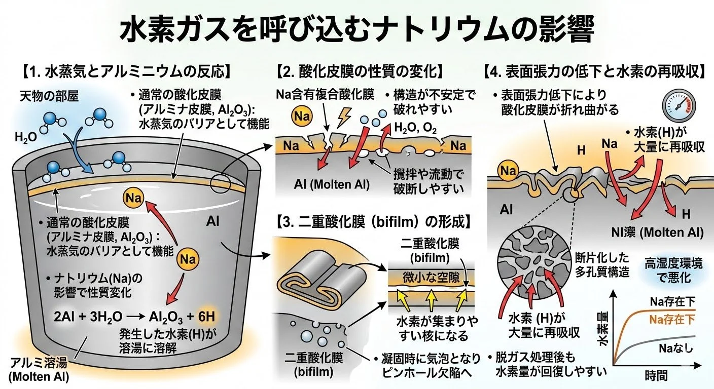 ナトリウムのいるアルミ溶湯表面の酸化皮膜は純粋なアルミナではなく、Naを含む複合酸化膜です.このような皮膜は通常のアルミナ皮膜に比べて構造が不安定になり、攪拌や流動によって破れやすくなることが知られています.その結果 溶湯と大気が接触しやすくなり、水蒸気との反応や酸化反応が起こりやすくなります