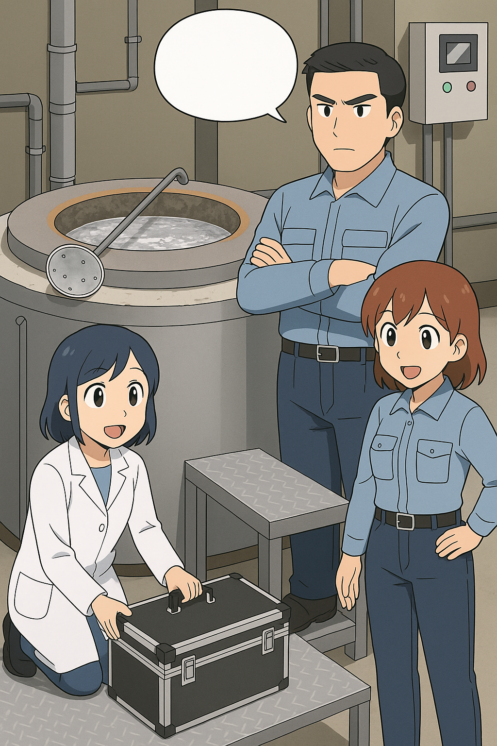 Kanae: "Herr Ohtani hat mir berichtet, dass Sie neue Erkenntnisse und Technologien in Ihren Aluminiumguss integrieren möchten. Heute erkläre ich zunächst die Schmelzequalitätskontrolle mittels thermischer Analyse, gefolgt von einem Versuch vor Ort. Je nach Ergebnis möchten Sie dann auch das Dosiergerät und das Flussmittel testen. Da es sich um einen kostenpflichtigen Service handelt, werde ich eine gründliche Untersuchung durchführen. Da einmalige Maßnahmen jedoch selten ausreichen, um das Know-how wirklich zu verinnerlichen, empfehle ich Ihnen dringend, auch unseren technischen Jahresvertrag in Betracht zu ziehen."