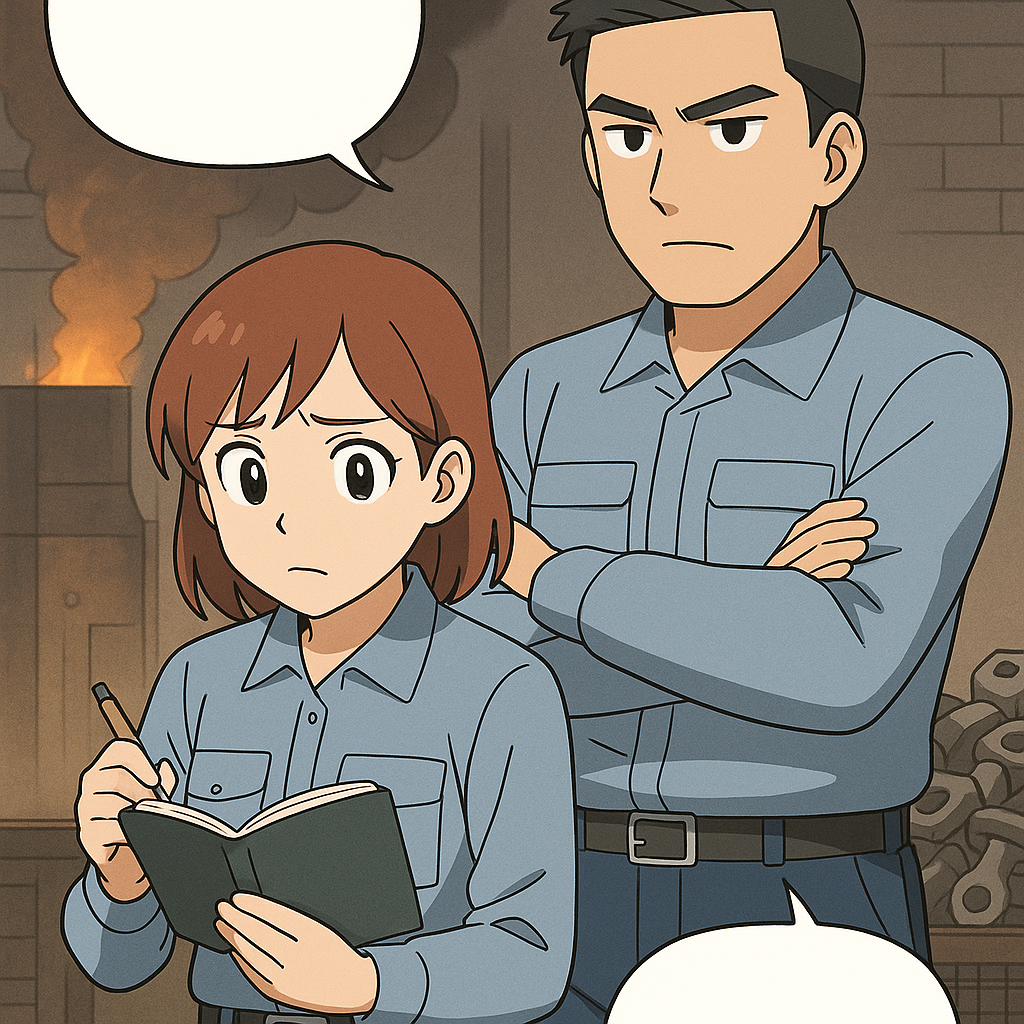 미나토: "나기사, 또 그 작은 수첩이랑 씨름하고 있나? 현장은 경험과 감이야. 뭔가 바꿔보고 싶은 마음은 알겠지만, 괜히 건드렸다가 불량이 지금보다 늘어나면 네가 책임질 수 있어?"